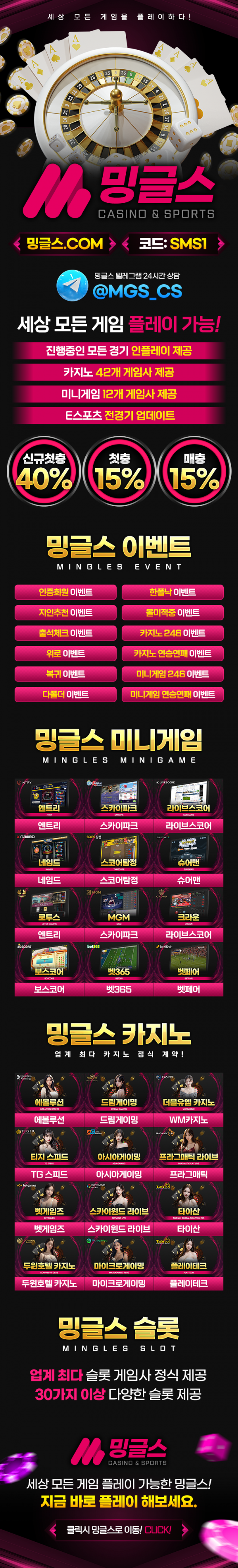 세상 모든게임 플레이 가능, 신규40% 첫충15% ,매충15%